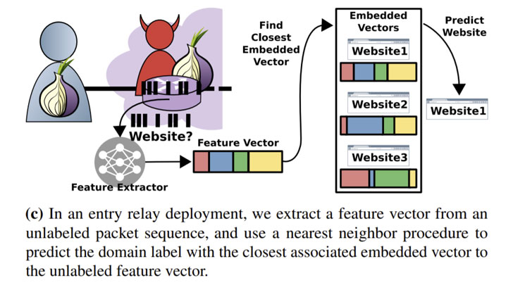 Ataques de impressão digital de sites no Tor visam quebrar essas proteções de anonimato e permitir que um adversário, observando os padrões de tráfego criptografado entre a vítima e a rede Tor, preveja o site visitado pela vítima. O modelo de ameaça desenvolvido pelos acadêmicos pressupõe um invasor executando um nó de saída - de modo a capturar a diversidade do tráfego gerado por usuários reais - que é então usado como uma fonte para coletar traços de tráfego do Tor e desenvolver um modelo de classificação baseado em aprendizado de máquina sobre as informações coletadas para inferir as visitas dos usuários ao site.
